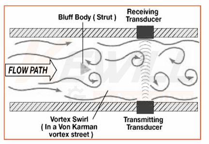 "FV10插入式蒸汽流量计是利用卡门涡街原理进行测量的,在测量管中垂直插入一个柱状物,流体通过柱状物时,一定条件下,在柱状两侧就会交替产生两列有规则的旋涡,如下图所示意,这两列旋涡被成为“卡门涡街”,在d/D=0.281时,释放的旋涡最稳定,卡门涡街释放的频率与流体流动的速度及柱状物的宽度等有关系,可单的用下面的公式来表示:"